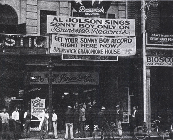 The famous 1929 photo showing Brunswick House and Al Jolson’s ‘Sonny Boy’ also shows part of the signage for the Majestic Bio-Cafe and tea room, which was on the upper level. In 1910, it was known as the Vaudette Theatre.