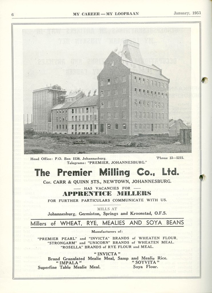 Premier Milling was Founded by Joffe Marks in 1913 and was a successor to Marks & Co. which was founded in 1890. It all started with one mill in Fordsburg and the merging of Marks & Co and Premier Roller Flour Mills. In 1916, expansion facilitated new premises in Newtown. According to JHF Heritage list, the building on the corner was designed by Theophile Schaerer in 1914 who was also responsible for the Great Synagogue on Wolmarans Street.