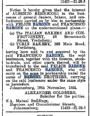 Enzo Secundo sent me the following information and a photo about the Barone Brothers: The photo below “was given to me by Anna Bayne Gallarate and her mum Giuseppina Barone Gallarate, both now living in NZ. Giuseppina is the little girl standing behind the first truck on the left: the place is Fordsburg…Anna and her mum descend from a rather large family that emigrated to Joburg from the Avigliana (Turin Province) area, from which many “Cartuccere” came: they were the women who had learned how to pack explosives into dynamite sticks at the Nobel plant in Italy. Giuseppina Barone’s dad and brothers and other helpers are in the picture: she later married a Gallarate, from more or less the same Italian region, who was a poultry farmer.”