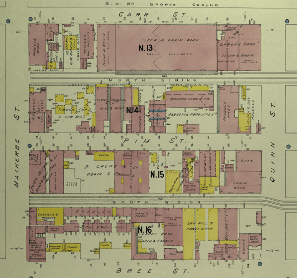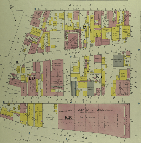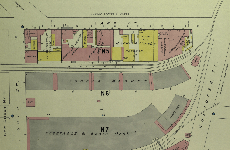 These businesses were listed on the 1974 map. A handful of old buildings still remain, but unfortunately no history. On Goads map, the northern side of Carr Street in this section is listed as ‘1 story stores and yards’