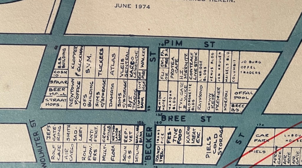 The next section covers the blocks east of the market buildings in Pim, Bree and Jeppe Streets (named Gwigwi Mrwebi, Lilian Ngoyi and Raheema Moosa streets respectively today)