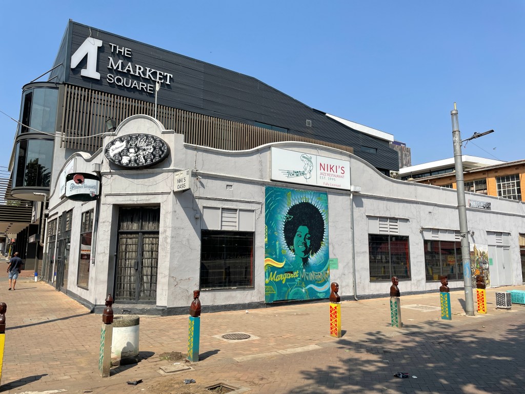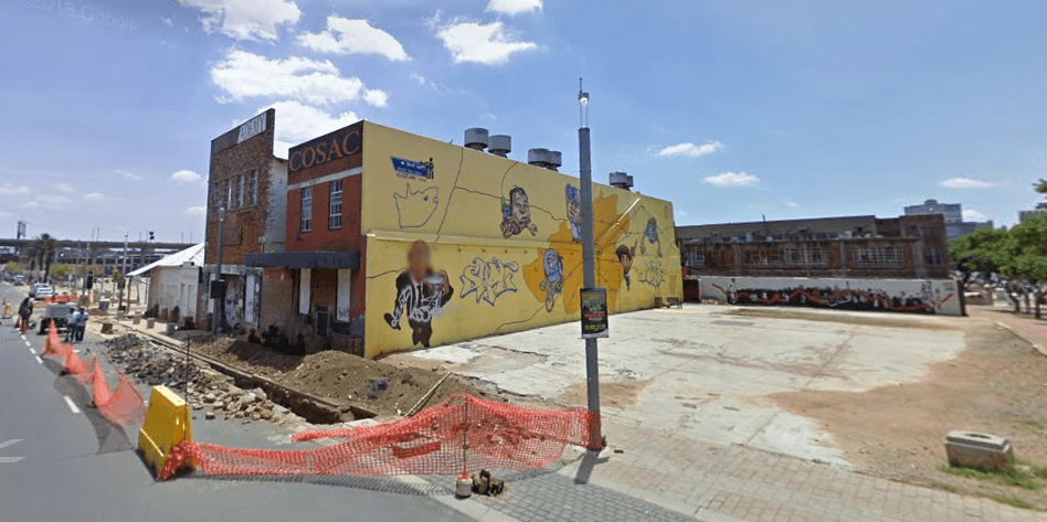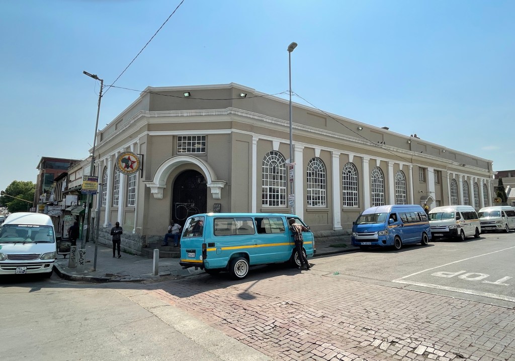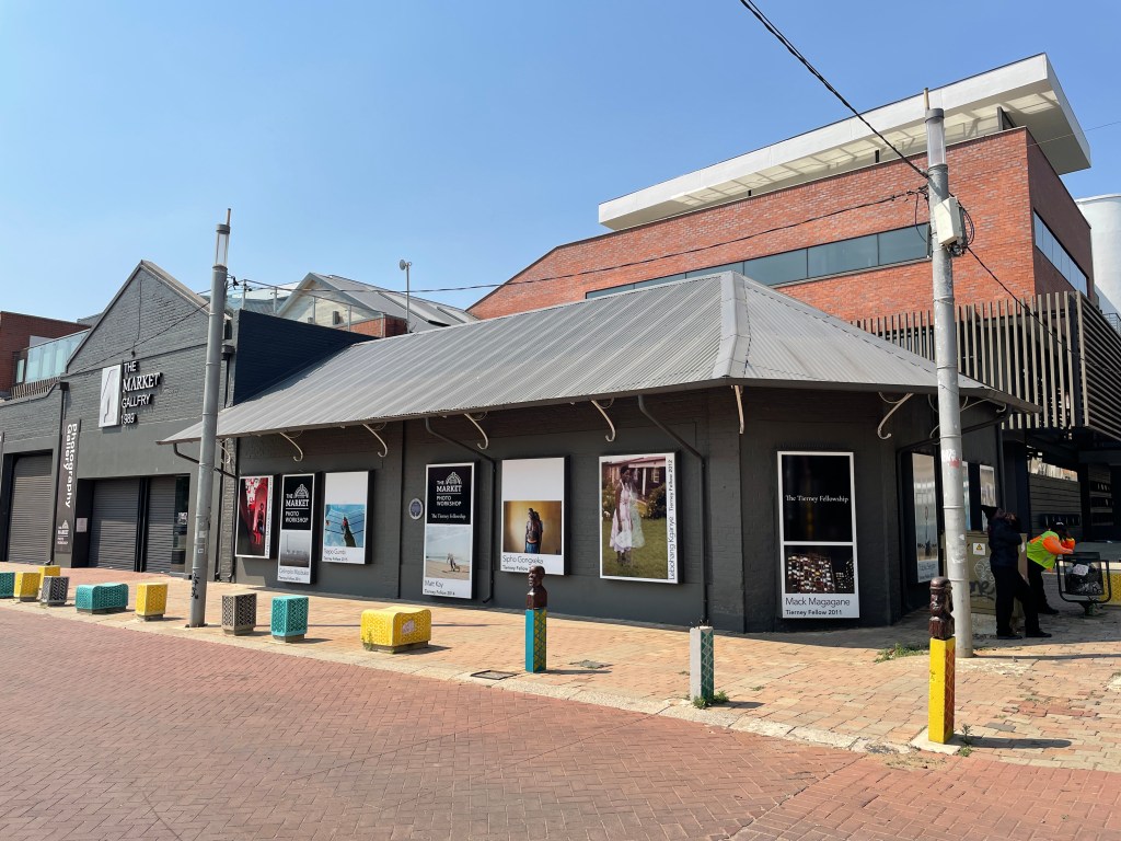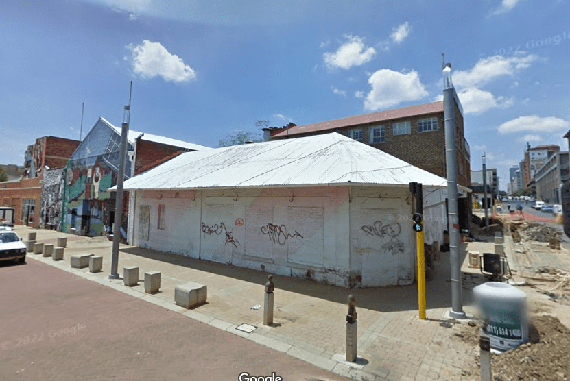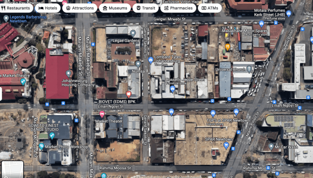 Note that Becker Street is now Gerard Sekoto Street. Miriam Makeba Street was built c1985 when the area was reconfigured after the cooling towers were demolished. All the original stands were demolished to make way for the new street. At the same time, Wolhunter Street outside of the Market Theatre was converted into a pedestrian walkway that extends down to Jeppe Street and later renamed Margret Mcingana Street.