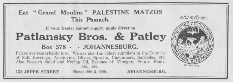 Morris left, leaving Bernard and Joseph to continue. After the war, the name was changed to Patlansky Brothers and again in 1922 to Patalsky Brothers & Patley. The oil business became Universal oil. The Universal Oil premises by Cook & Cowin c1926 was in Jeppe Street (which still stands next to the School Clinic) and although they moved to different addresses in Jeppe Street, their association with Jeppe Street spans 60 years. In the 1930s they purchased Alderton LTD (Potgietersrus) which manufactured Black Cat oil and Peanut butter until they sold it to Tiger Oats in 1948. In 1981, the business was taken over by Chipkins and the name changed to Patley’s (pty) Limited. Besides oil, they also imported continental delicacies from around the world. The premises listed in Newtown was likely a warehouse given its proximity to the railway siding.